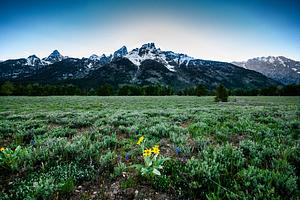 A small bloom of wildflowers in front of the Teton Range. Grand Teton National Park, Wyoming