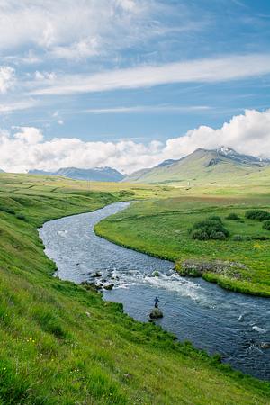 A fly fisherman casts into a river, hoping to hook Atlantic Salmon. Northern Iceland
