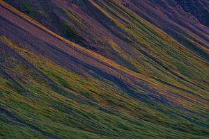The midnight sunset paints the slope of a valley in stripes of green and orange. Northern Iceland