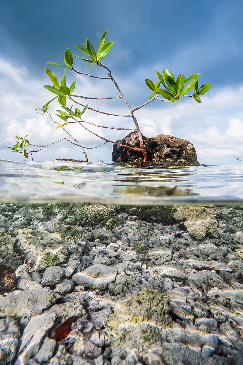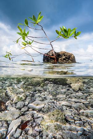 A young mangrove planted to protect coastal property from storms clings to a rock. Turneffe Atoll, Belize